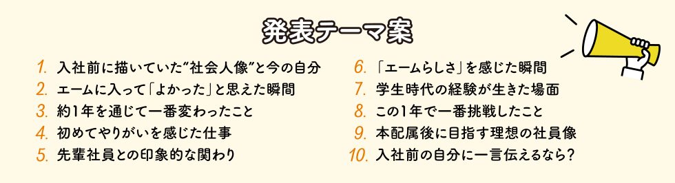 次回は第2弾として、「先輩社員との印象的なかかわり」「エームサービスに入って良かったと思えた瞬間」をテーマにした発表をご紹介します。お楽しみに!