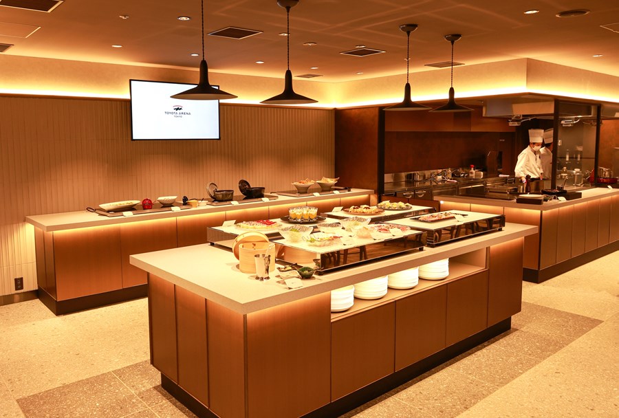 プライベートな個室空間のスイートでは、上質な空間で快適にお過ごしいただくためのきめ細やかなサービスと、四季折々の食材や豊洲市場から仕入れた食材をアリーナ内のキッチンで調理したお料理を、ビュッフェ形式でお楽しみいただけます。